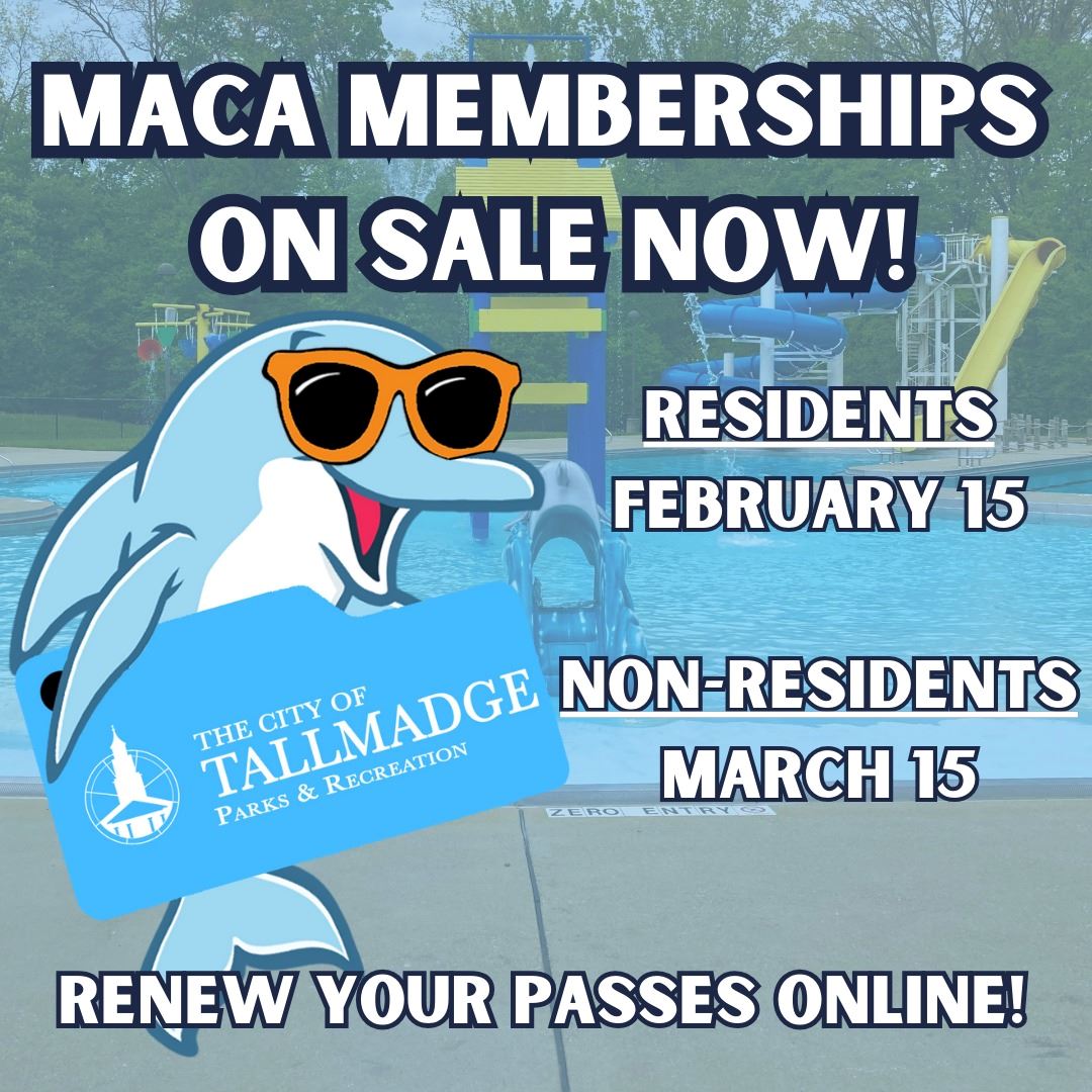 Maca Memberships are on sale now!Renewals can be done online or in-person. New memberships must be purchased in person at the Recreation Center. New members must bring a photo ID, proof of residency, and birth certificates for any children on the membership.Find our prices here: https://www.tallmadgeoh.gov/maca