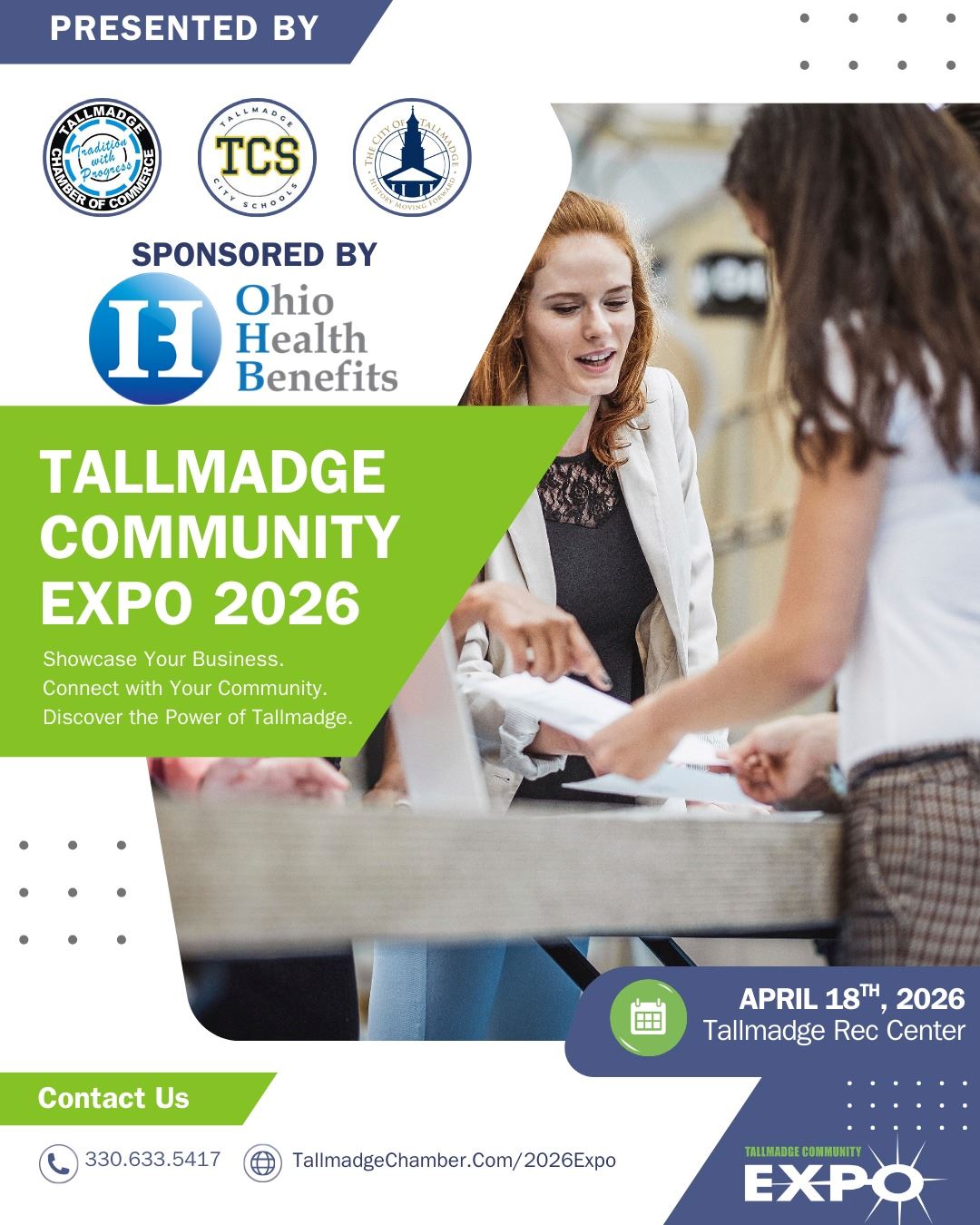 The countdown is on for the Tallmadge Community Expo 2026!We are excited to bring our community together through this great collaboration between the City of Tallmadge, the Tallmadge Chamber, and Tallmadge City Schools.Date: April 18, 2026Time: 10 am-2 pmLocation: Tallmadge Rec CenterEnjoy a full day of connection, networking, and celebrating everything that makes our community strong. Whether you're a local business looking to grow your visibility or a resident wanting to explore local resources, there’s something for everyone.Register with the Tallmadge Chamber as a business or event sponsor: tallmadgechamber.com/2026ExpoQuestions? Call the Tallmadge Chamber at 330.633.5417 -